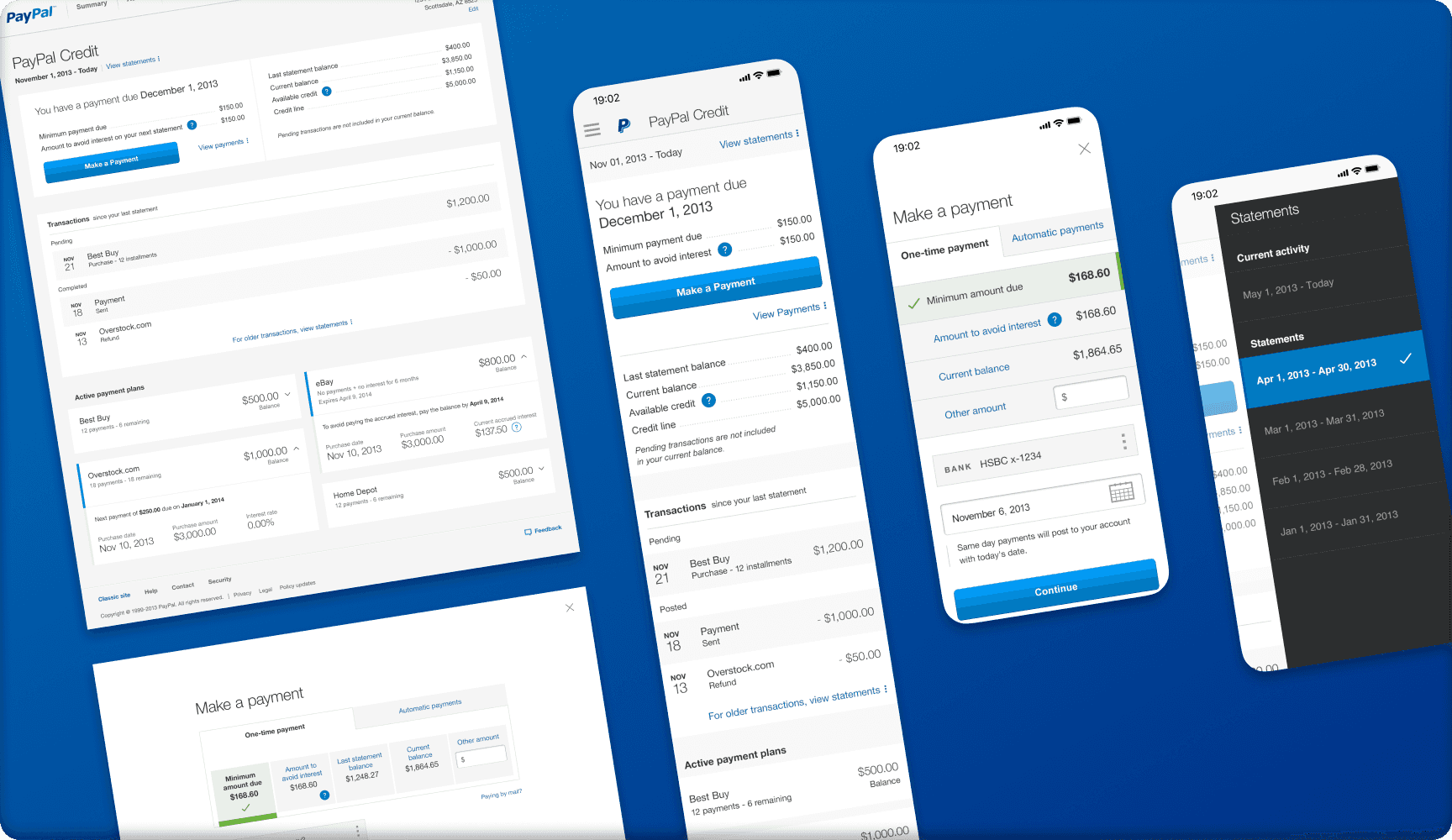 As lead UX & UI designer for the initial launch of the PayPal Credit servicing platform and payments flows, and its implementation into the core experience, I worked on products released in the US, UK, and Germany. PayPal Credit grew to a $6B portfolio with tens of millions of users in its first few years.