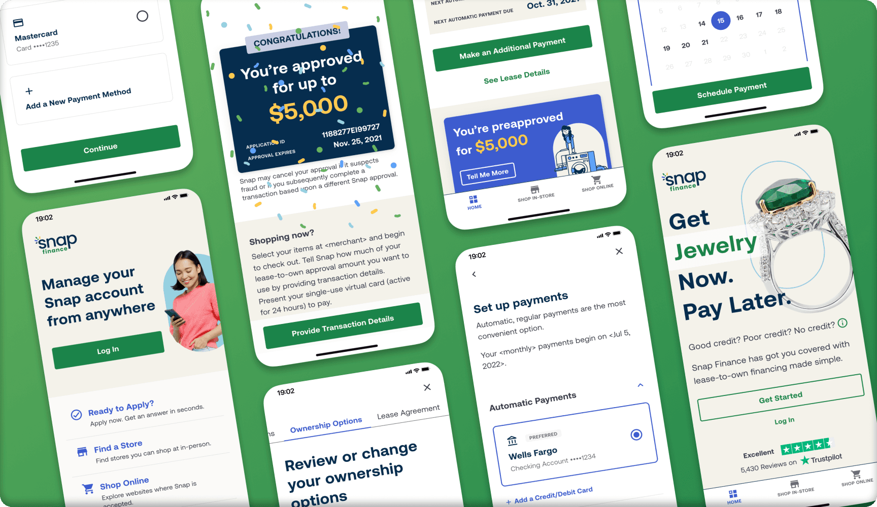 I led the design of Snap Finance’s first mobile app spanning account servicing, repayments, originations, and Auth, while influencing two corporate rebrands and the adoption of a novel design system, driving 1M downloads and a 4.9 App Store rating by year two.