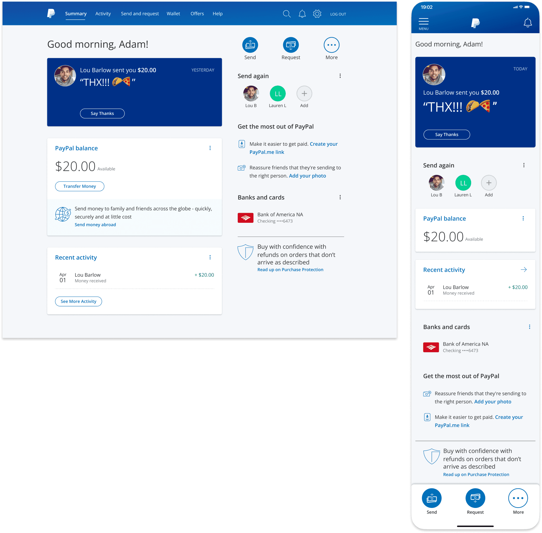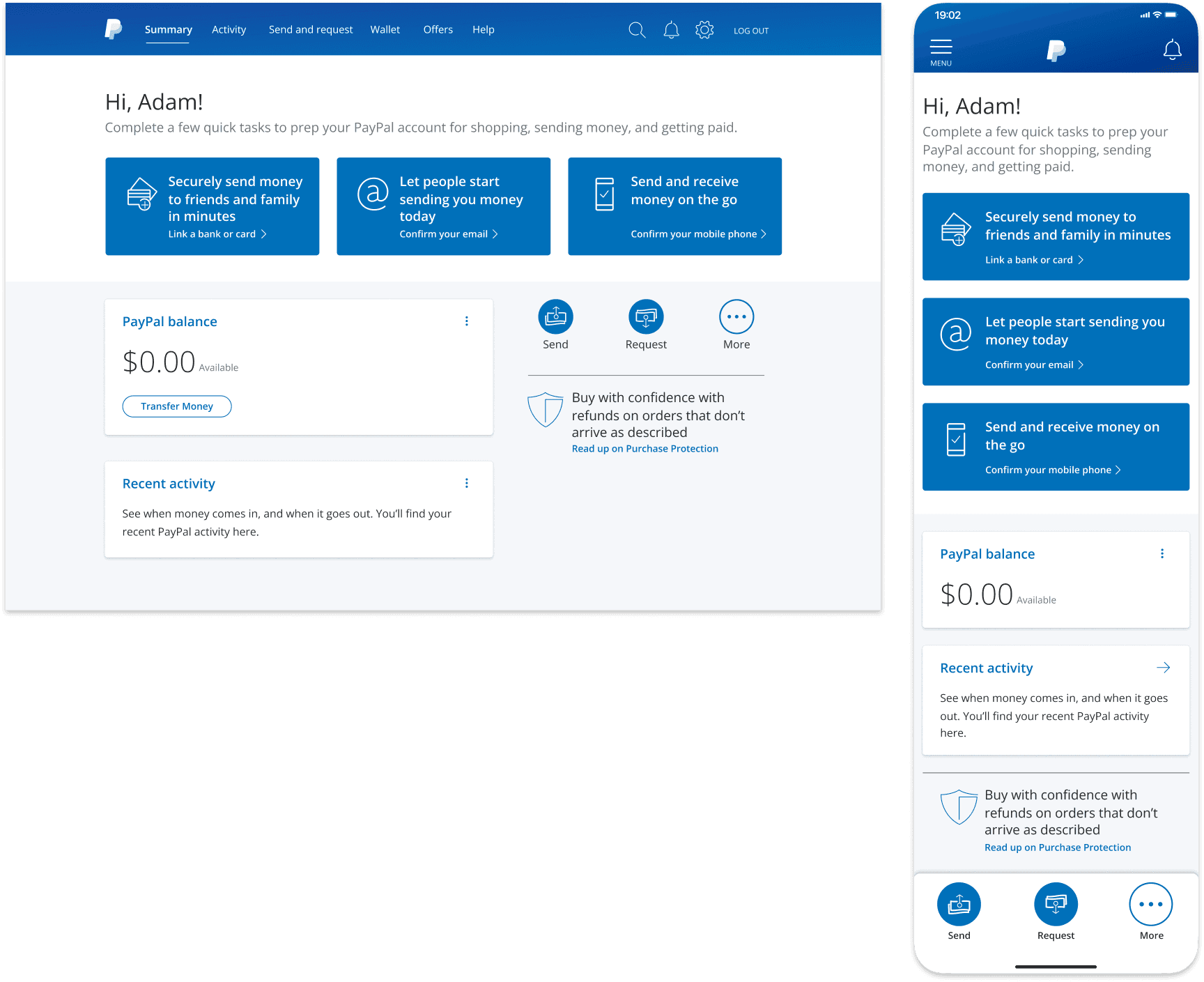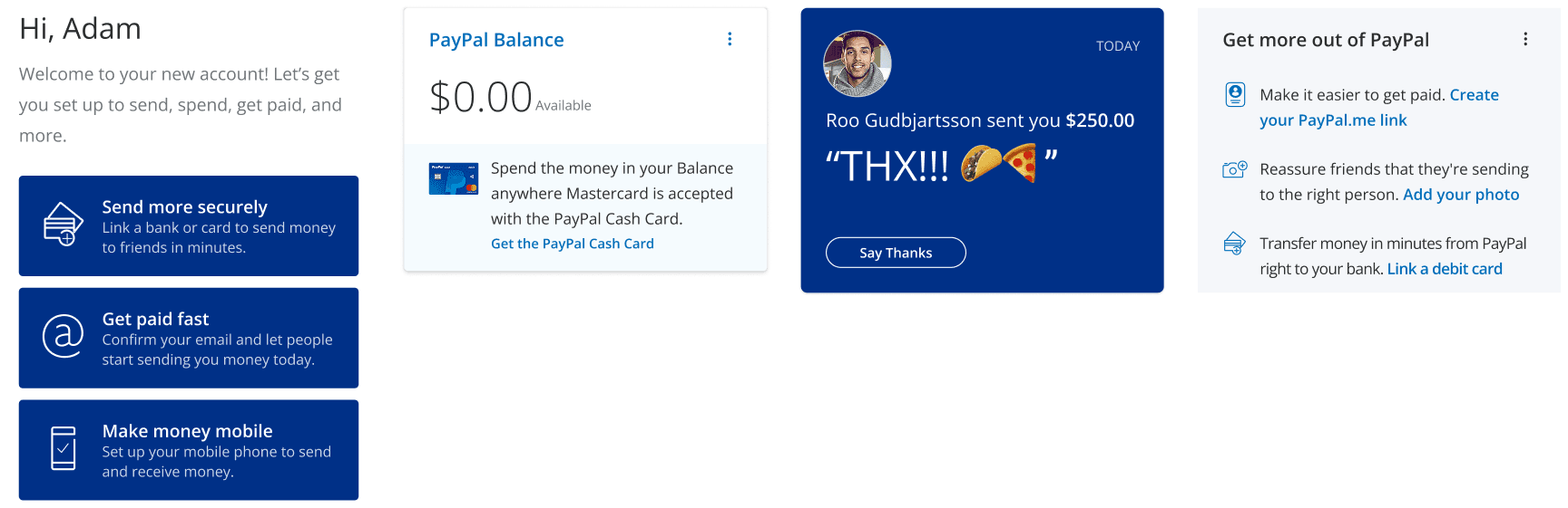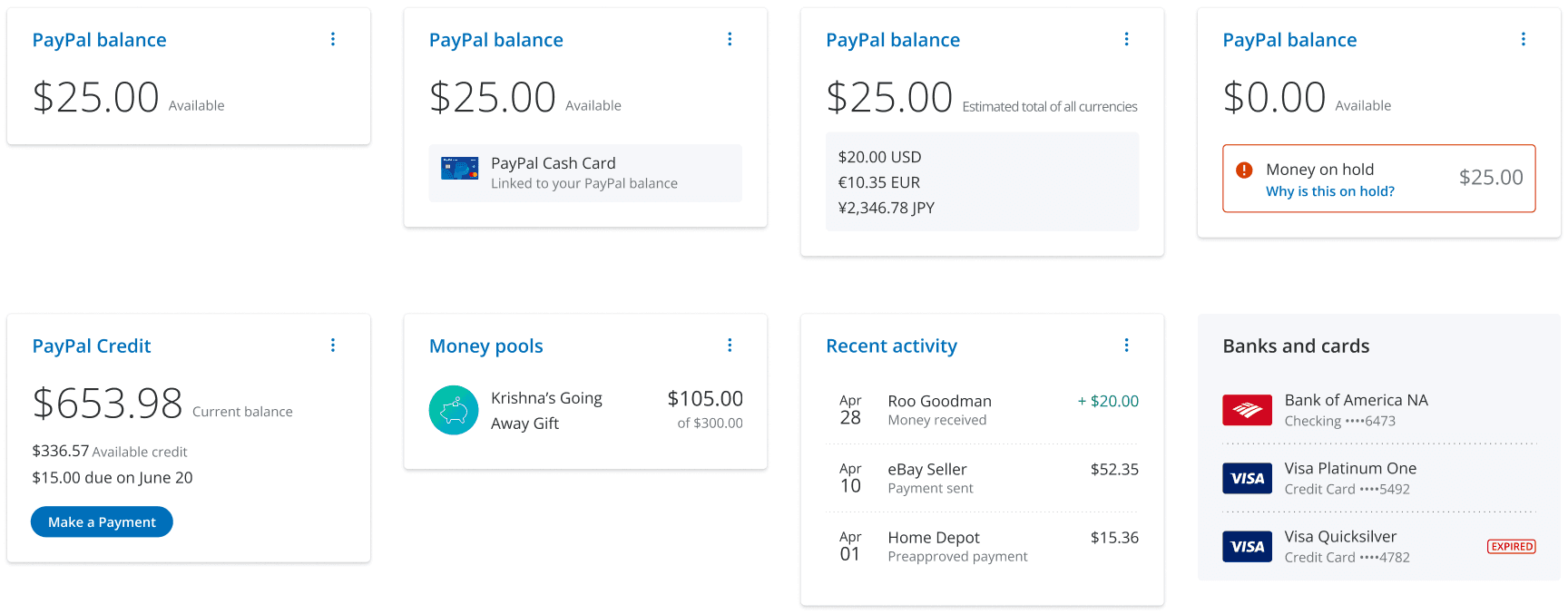 Drive engagement by tailoring the experience as the customer progresses through his/her PayPal lifecycle. Strive to maintain an at-a-glance, personalized view that highlights the overall status of the customer’s account, by focusing on: