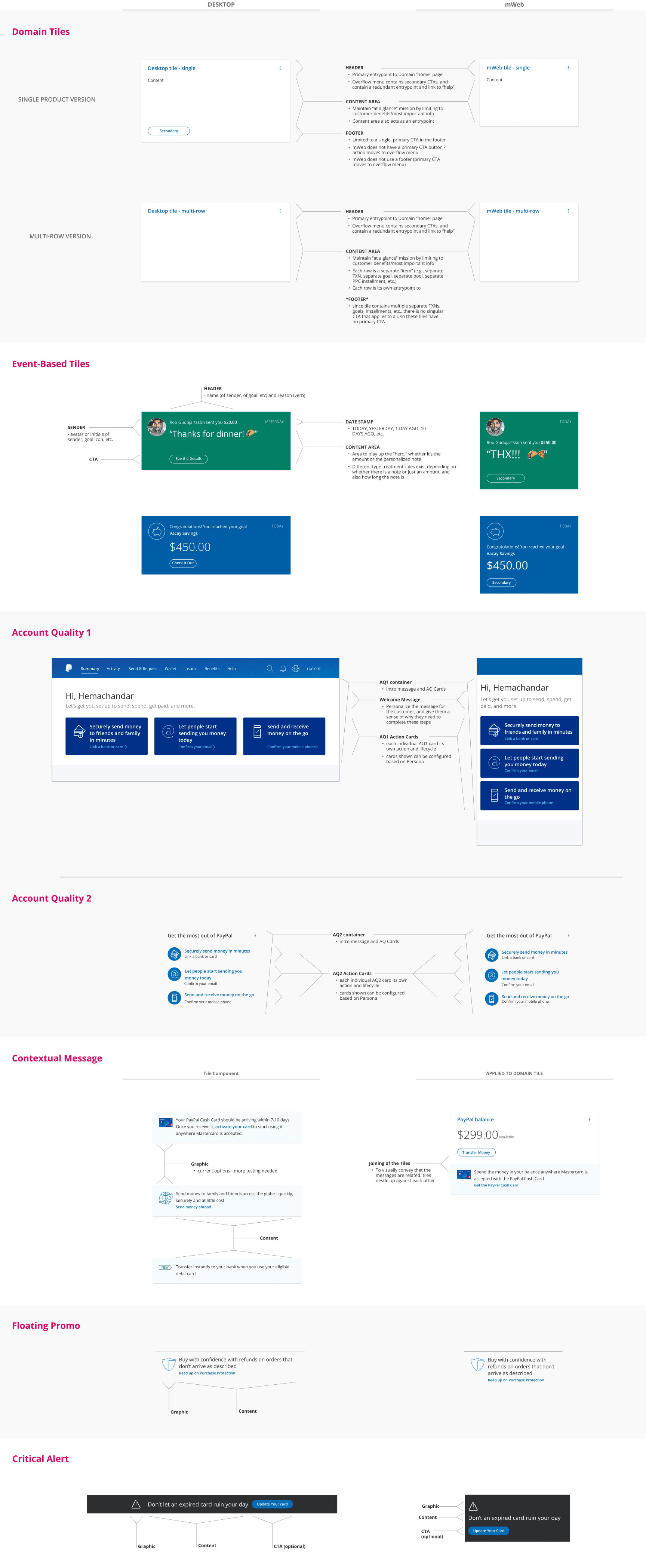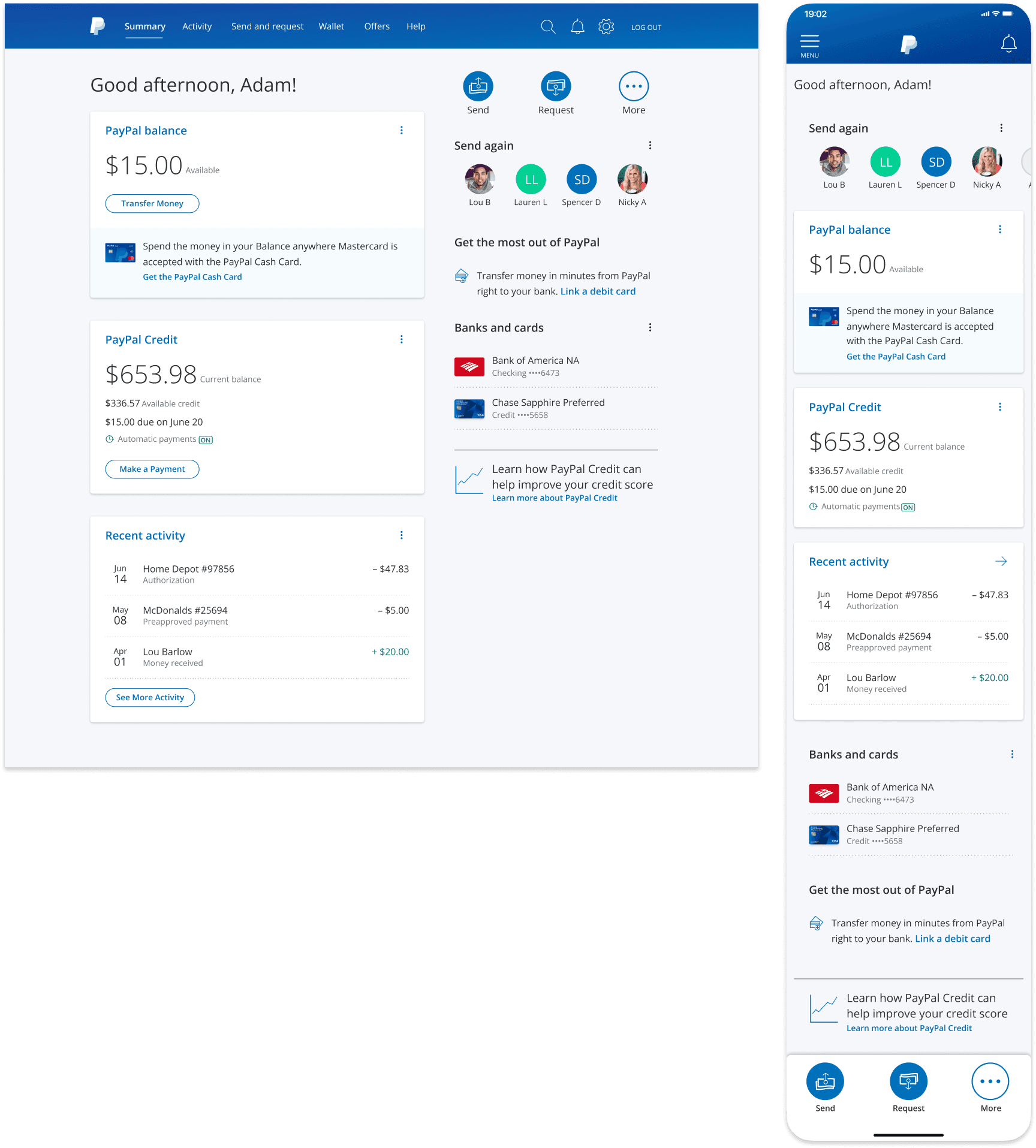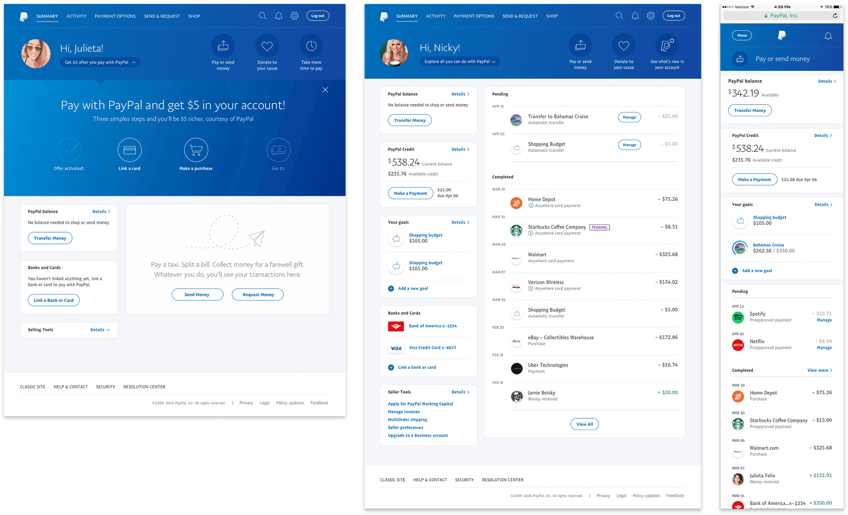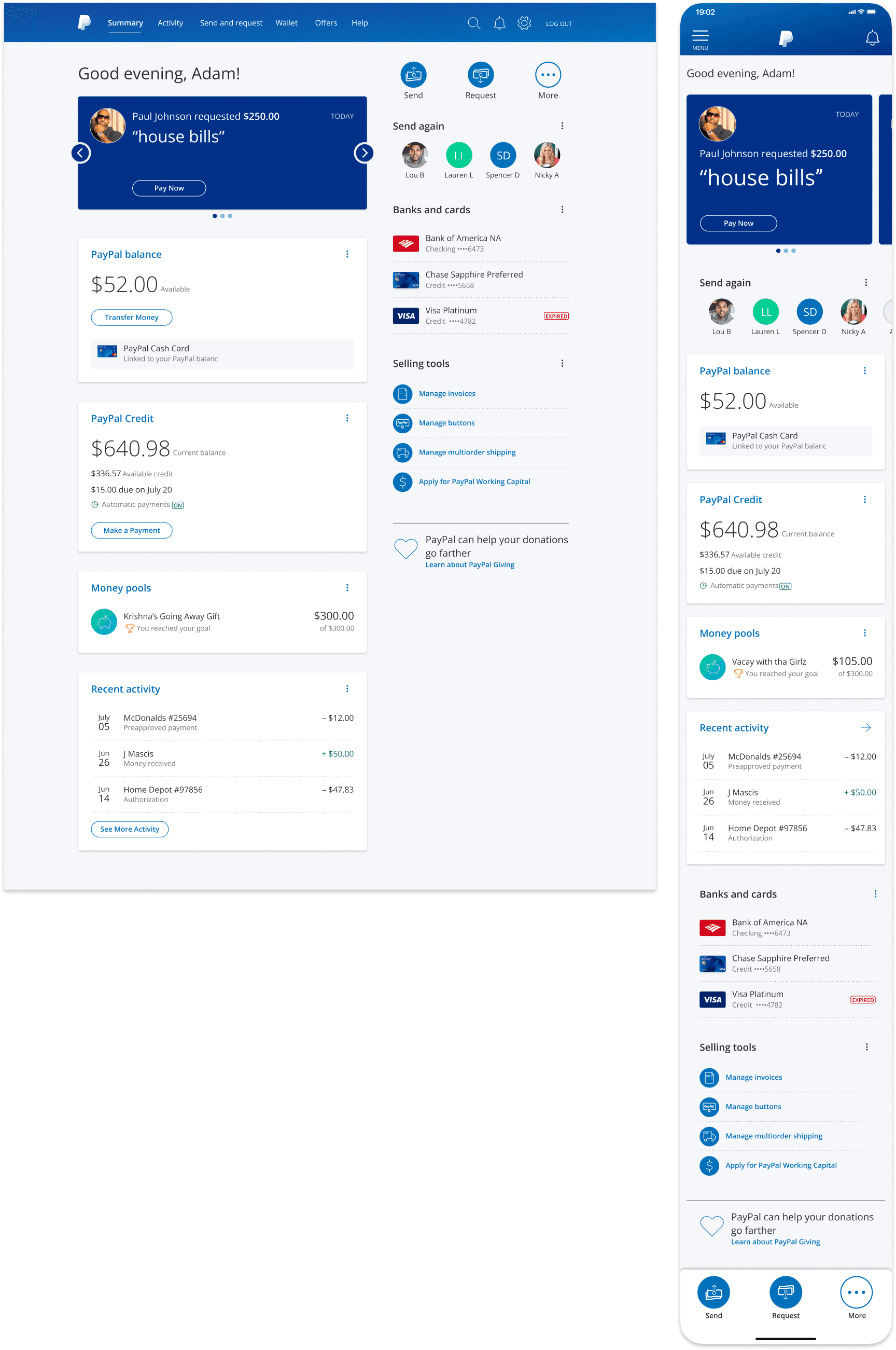 Drive engagement by tailoring the experience as the customer progresses through his/her PayPal lifecycle. Strive to maintain an at-a-glance, personalized view that highlights the overall status of the customer’s account, by focusing on: