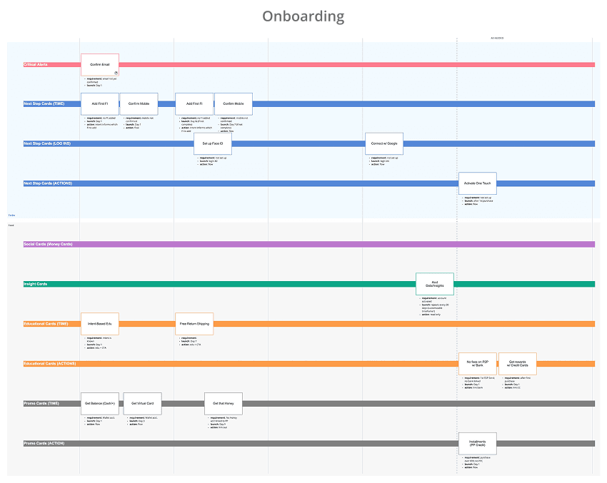 Working directly with two product teams, we pressure tested the framework to show how a smarter messaging system could help with longer term engagement by spreading out the messaging, and preventing customers from being overwhelmed by an avalanche of messages.