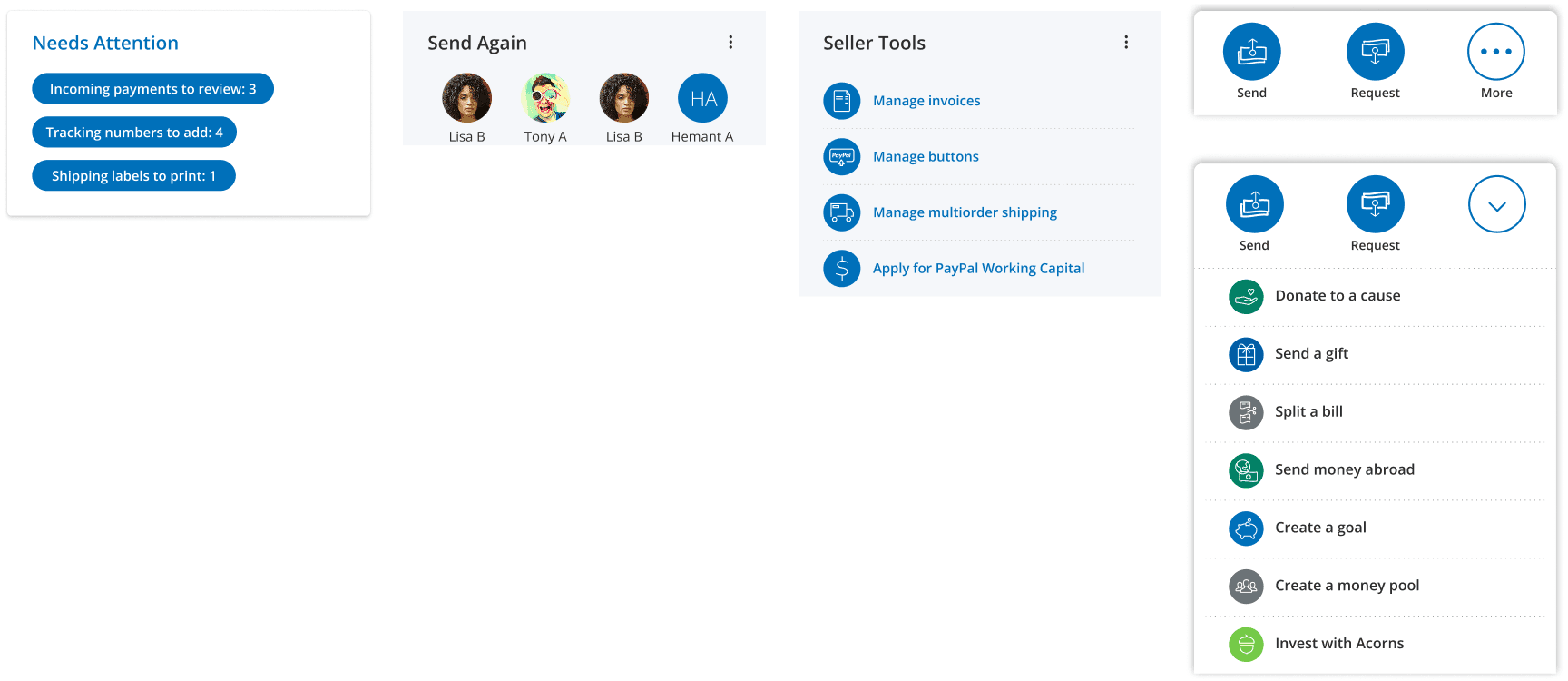 Quick Links, Needs Attention, P2P Send Again, Seller Tools