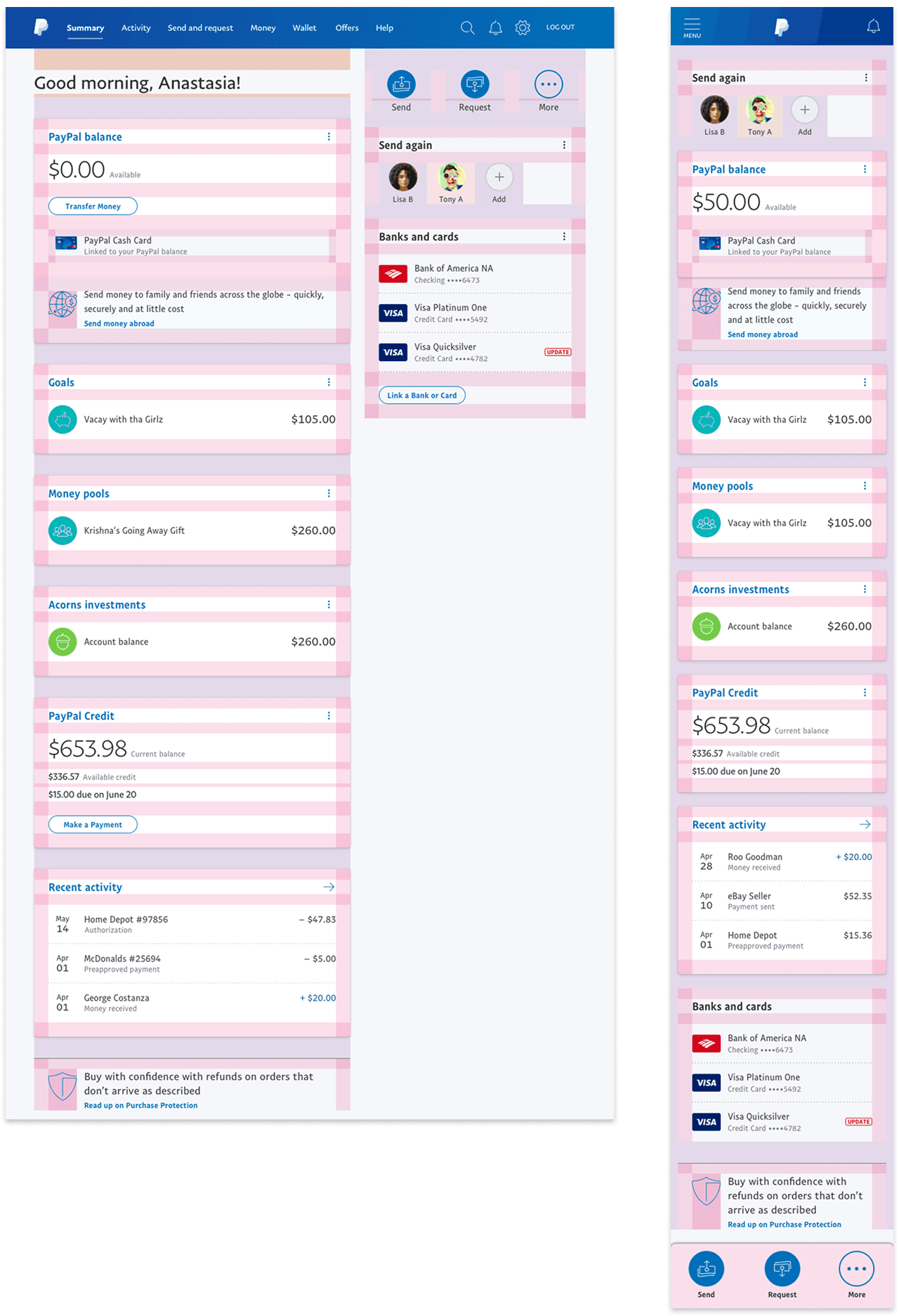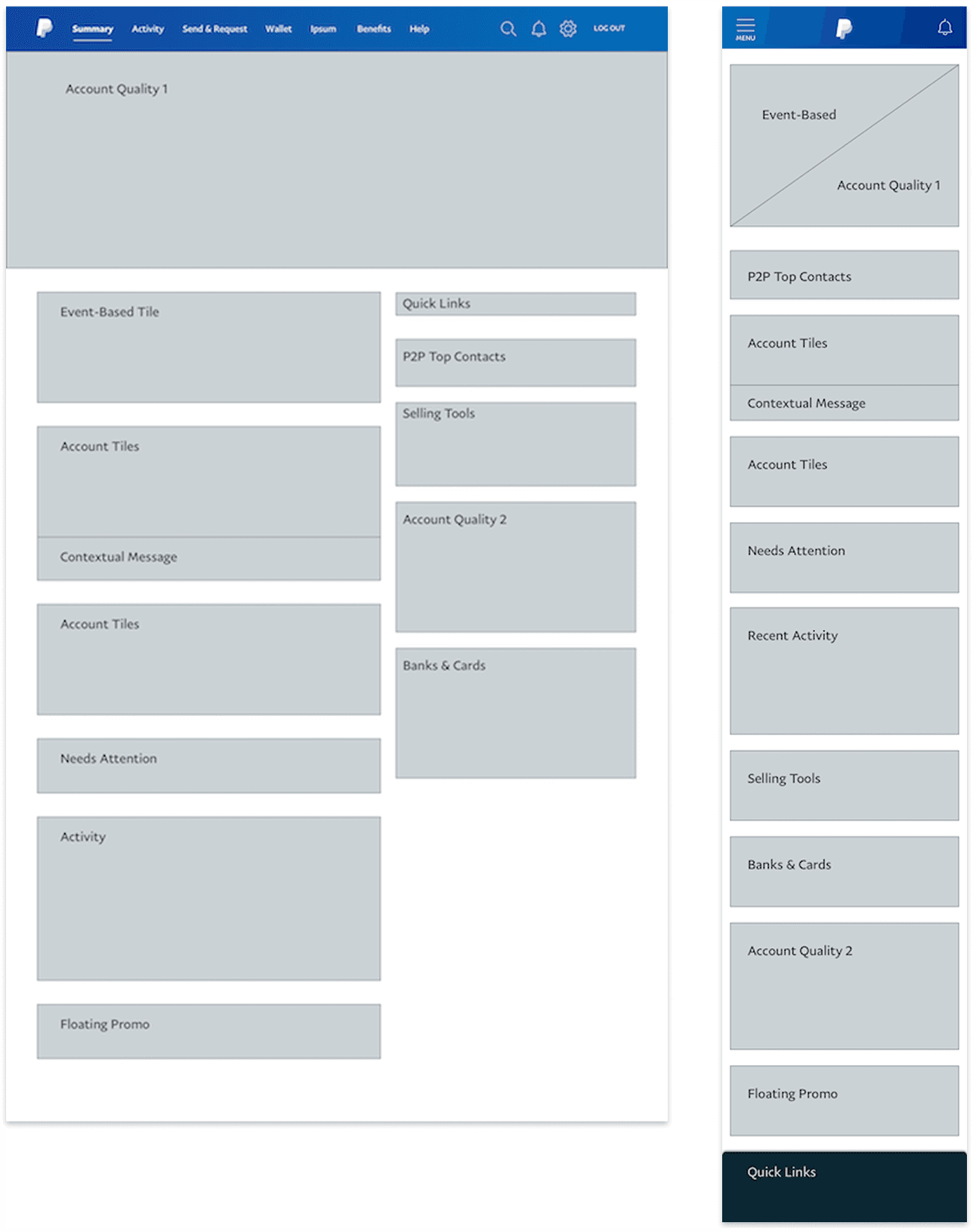 The desktop version utilized a 7/5 grid based on the 12 column Bootstrap framework. I applied a dual-layer (visual z-index) UI treatment to separate the primary and secondary tiles based on customer-informed importance. All “balance” and money-related tiles were wrapped in a floating white tile, while secondary info, messaging, and actions were placed directly on the background.