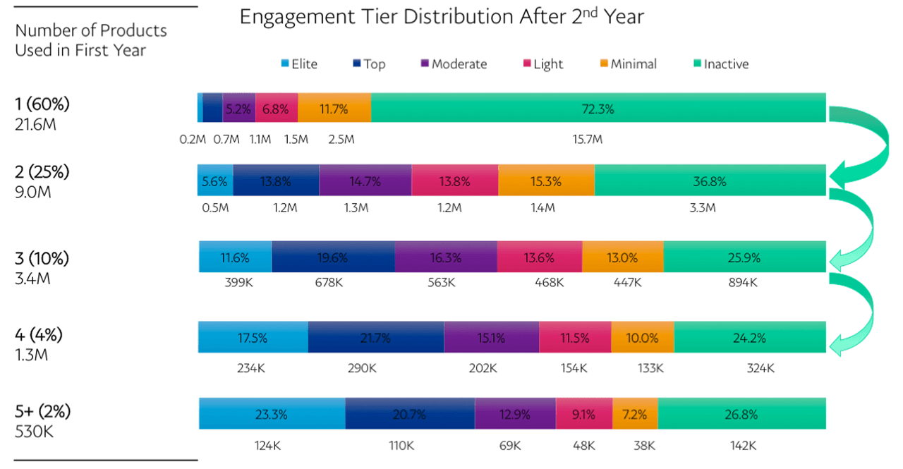 Data shows that customers who use more PayPal products their first year tend to be more engaged the following year.