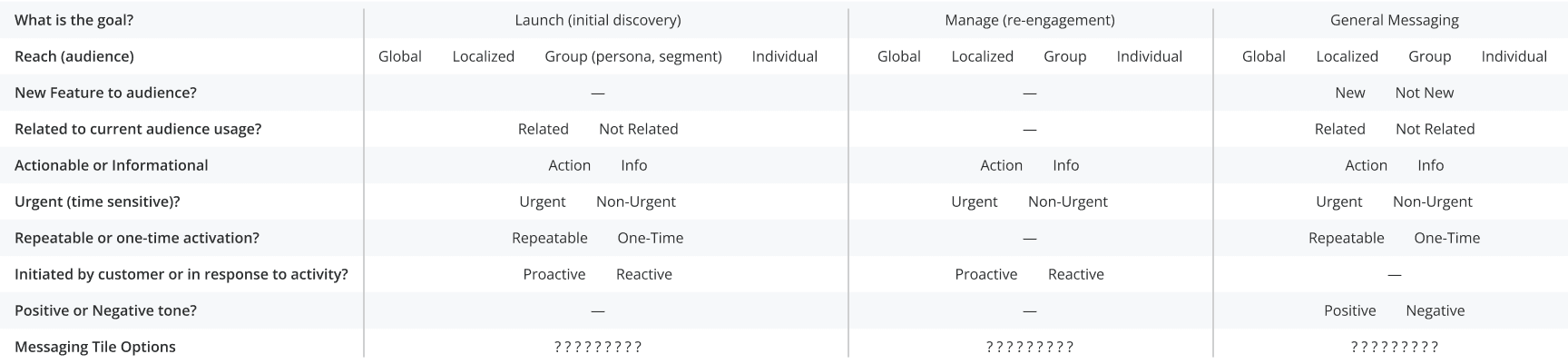The Messaging Framework I mapped out in partnership with the Product Director could have been really helpful for internal education and process but was never formally adopted